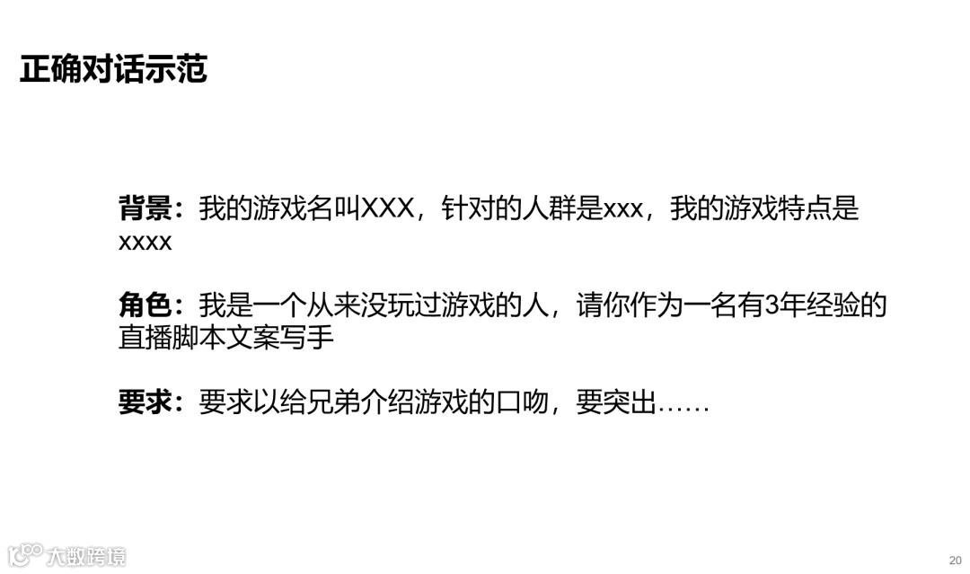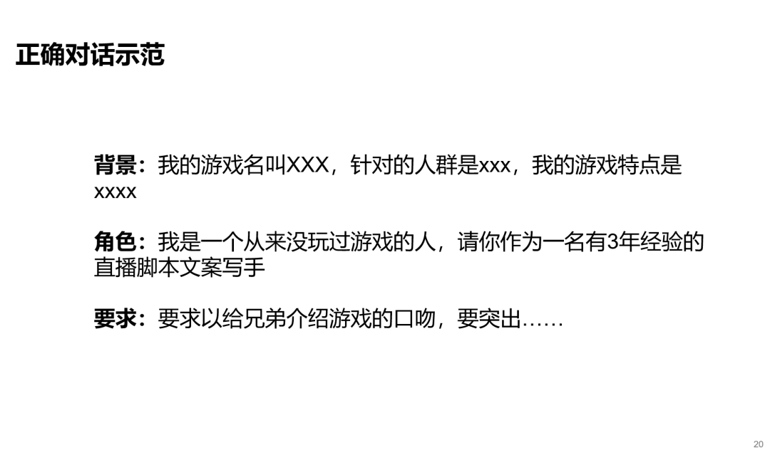 正确的对话示范是怎样的?还是以“生产游戏攻略直播的脚本文案”为例: