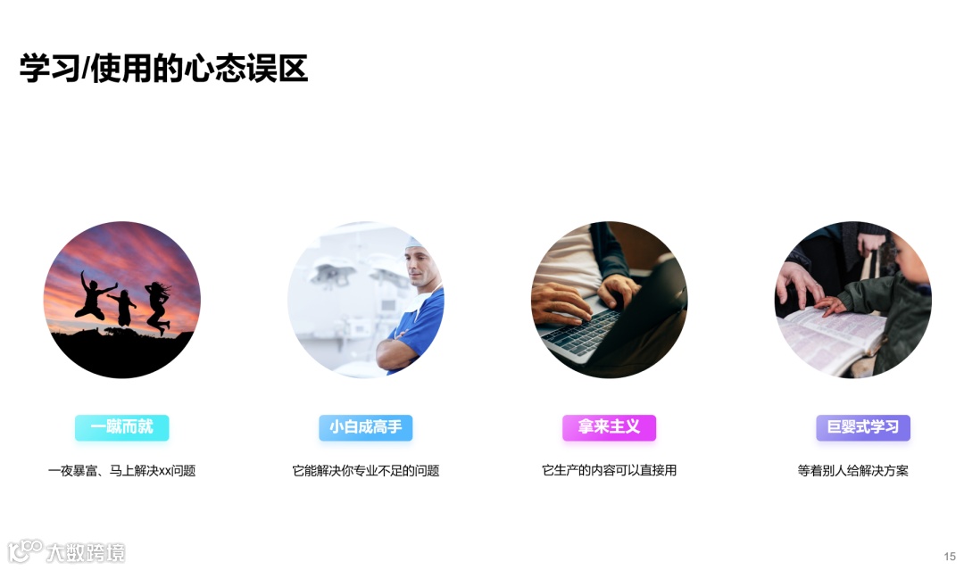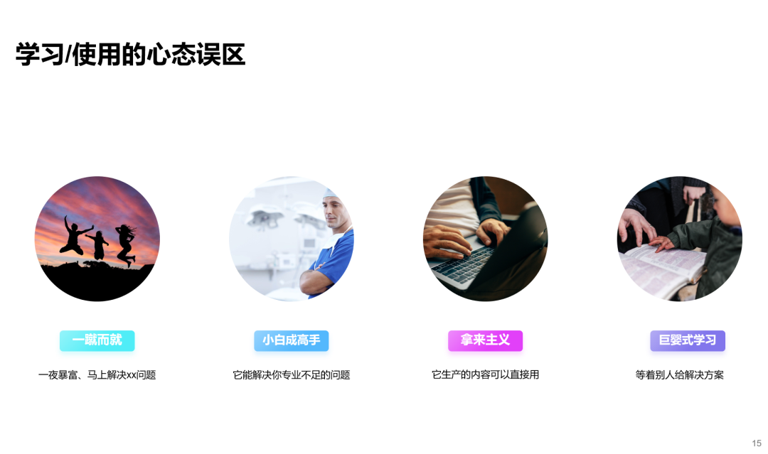 第一个是一蹴而就,认为我用了的GPT之后,我就能够马上解决所有的问题,甚至是一夜暴富,其实无论是学习、还是赚钱,都一样,都是循序渐进的,没有办法一蹴而就。第二个,会有一些学员认为,我自己在某个领域,比喻营销方面经验不足,ChatGPT能补足我这方面的经验,让我成为营销大师,我就能接咨询了,这也是一种误区。因为工具只是一个辅助,工具的使用高度依赖你的行业经验,你的行业经验才是试金石,他没有办法在短时间内让一个0经验的小白成为领域高手。
