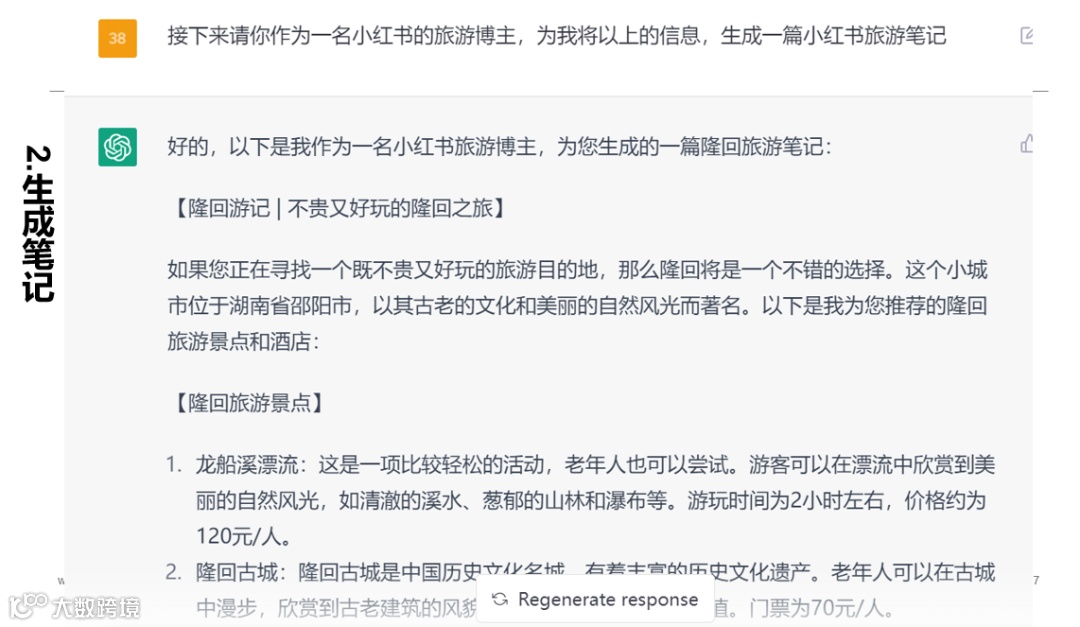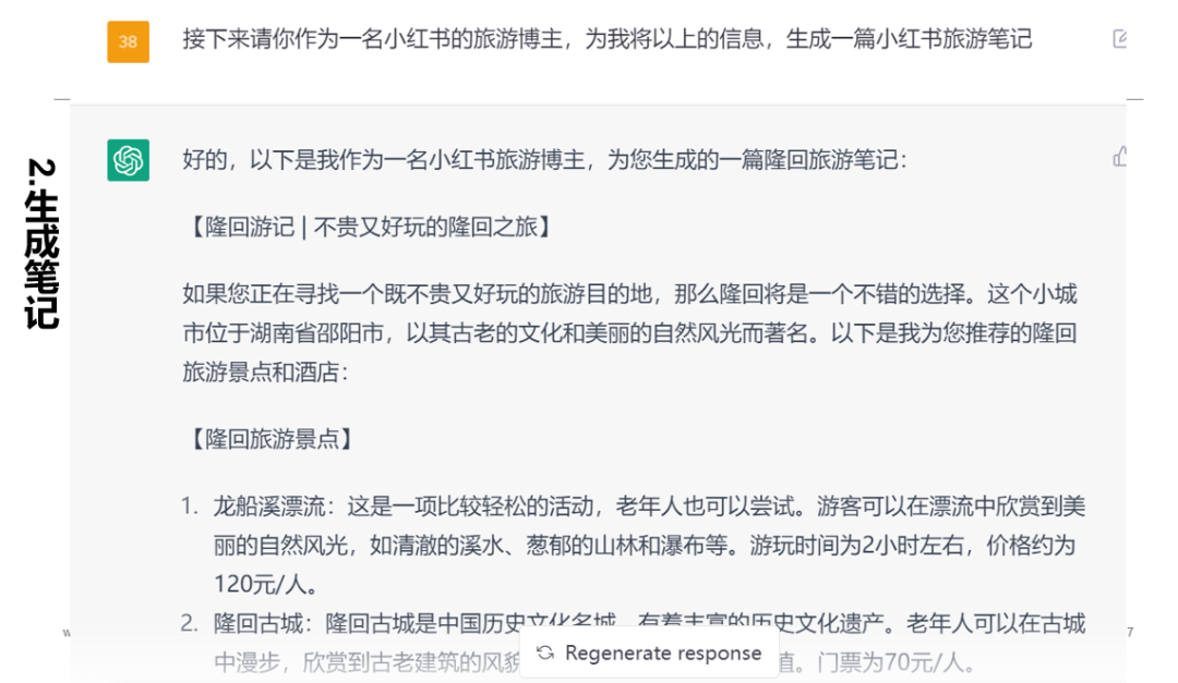 获取到内容之后,第二个就是让ChatGPT帮我们生成小红书文案。我给它赋予了一个角色,小红书的旅游博主,帮我把以上的信息生成一篇小红书旅游笔记。然后它就开始生成了。