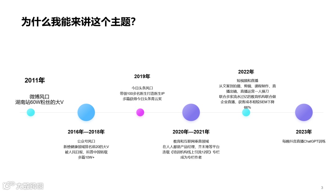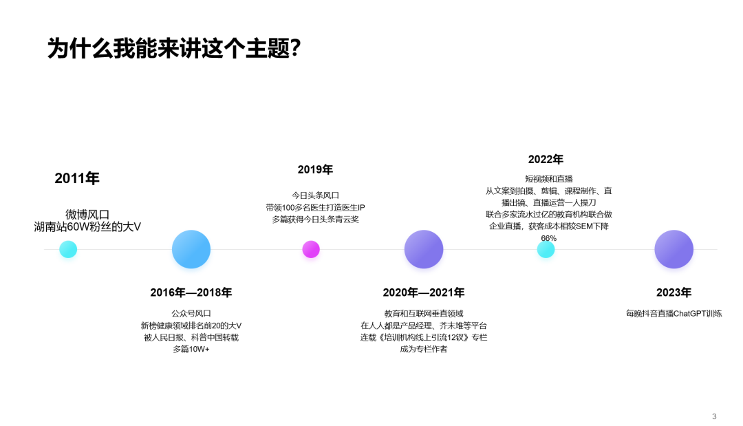 其实我知道ChatGPT是在今年1月,真正应用是在今年的二月初,我相信在群里面有一些小伙伴比我涉及得更早,去年已经开始涉足了,那为什么我作为一个后来者,我能来讲这个主题呢?除了本人的执行力较强之外,其实和我有12年内容运营的经验也相关。