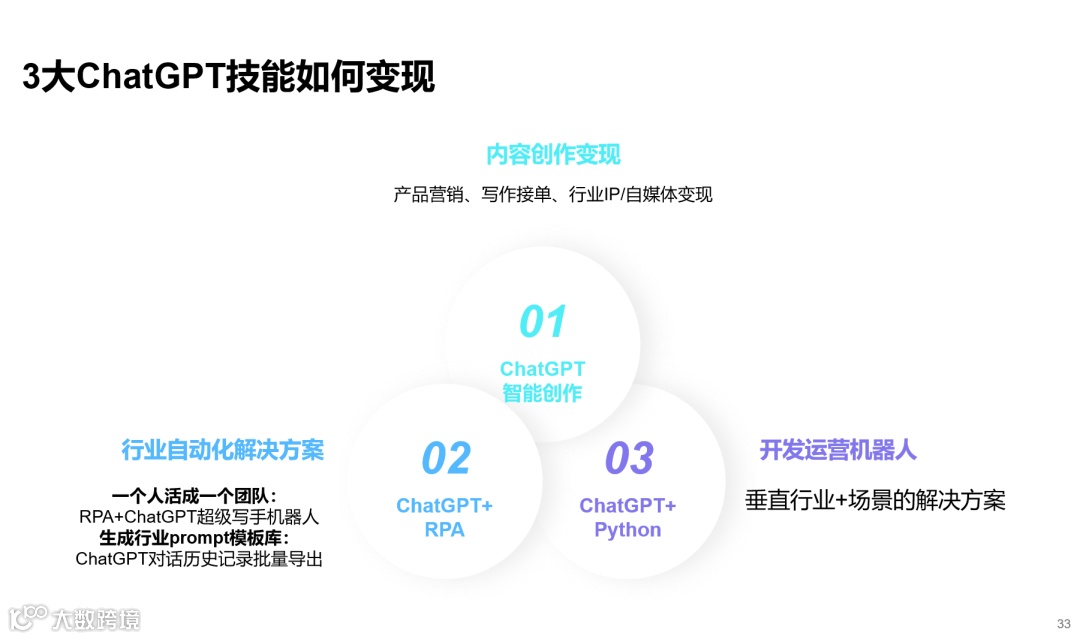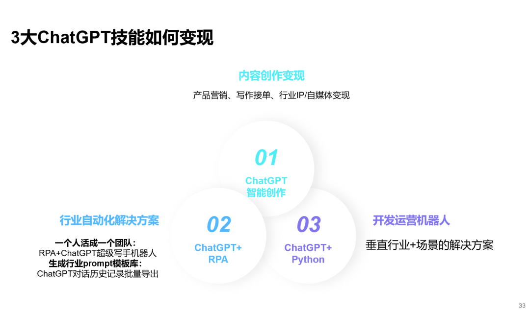 比如在智能创作方面,我们可以通过写产品软文、做营销海报,去做自媒体,售卖自己的产品,或者是利用业余时间进行写作接单,像我的学员学了两周,就可以接单变现。同时你还可以总结自己的行业经验,做行业IP,做自媒体变现。那么gt+pa如何变现呢?这里最重要的是一个人活成一个团队,比如我们已经推出了pa+的PPT超级携手机器人,在前面我也介绍过。我曾经带着一个做营养科普的新媒体团队,做到了新榜健康榜的前20强。在这个团队里,需要多个人来配合:营养专家、文案、社群运营+推广、插画师,但是有了ChatGPT+RPA,我们一个人可以活成一个团队。接下来这些人员的费用都省掉了。另外一个变现的途径,是我们可以在垂直领域里训练大量的案例,用RPA批量导出这些案例,生成行业的命令模板库,去做变现,现在已经有公司在做这件事,我们需要抢在别人的前面。