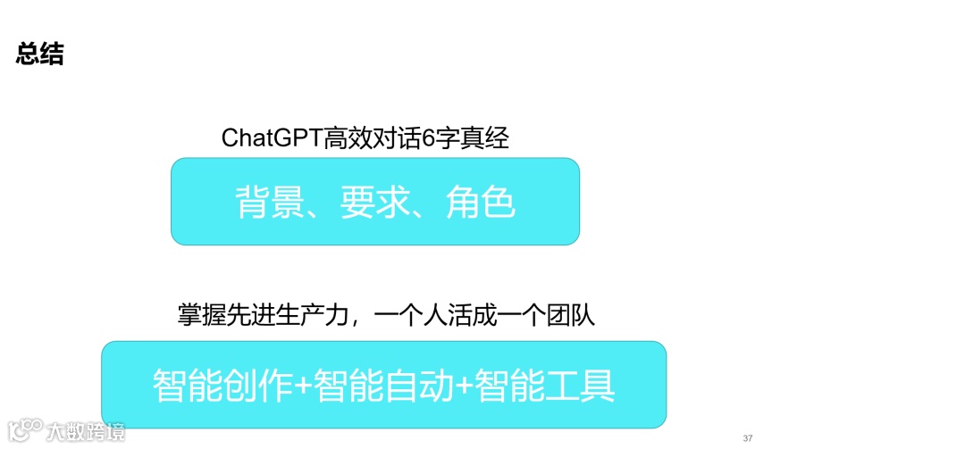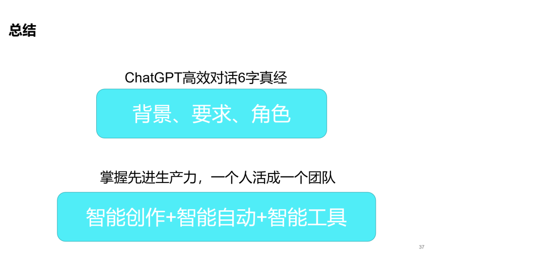 最后给到大家本堂课的总结:ChatGPT高效对话的六字真经:背景、要求、角色,你掌握了之后就能够提升90%的对话效率;第二个就是通过学习三大技能,智能创作、ChatGPT+rpa、ChatGPT+Python,掌握先进的生产力,一个人活成一个团队。