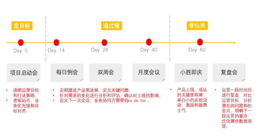 说起来似乎很容易,该如何把大家拉到一个战壕呢?这里,关键是我们的运营目标和策略制定好以后,就要围绕一些关键里程碑,定好运营节奏。