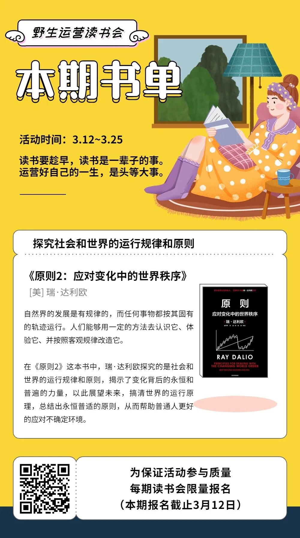 插入一条:3月12日~25日,野生运营读书会邀请你共读《原则2》这本现象级好书,豆瓣评分高达 8.6 。自然界的发展是有规律的,而任何事物都按其固有的轨迹运行。人们能够用一定的方法去认识它、体验它、并按照客观规律改造它。