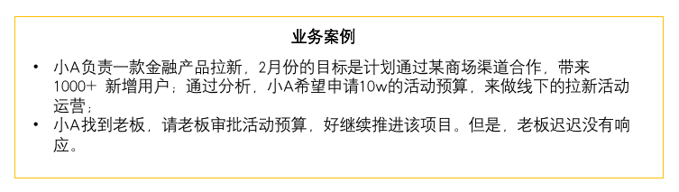 案例中的小A,给老板发消息,希望申请10w人民币的预算,用于和某某商场做线下渠道的拉新合作,可是老板却迟迟没有响应。