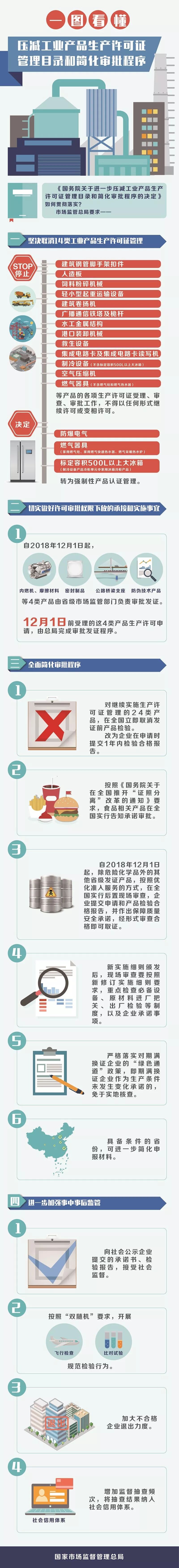 导读:《国务院关于进一步压减工业产品生产许可证管理目录和简化审批程序的决定》如何贯彻落实?市场监管总局提出要求: