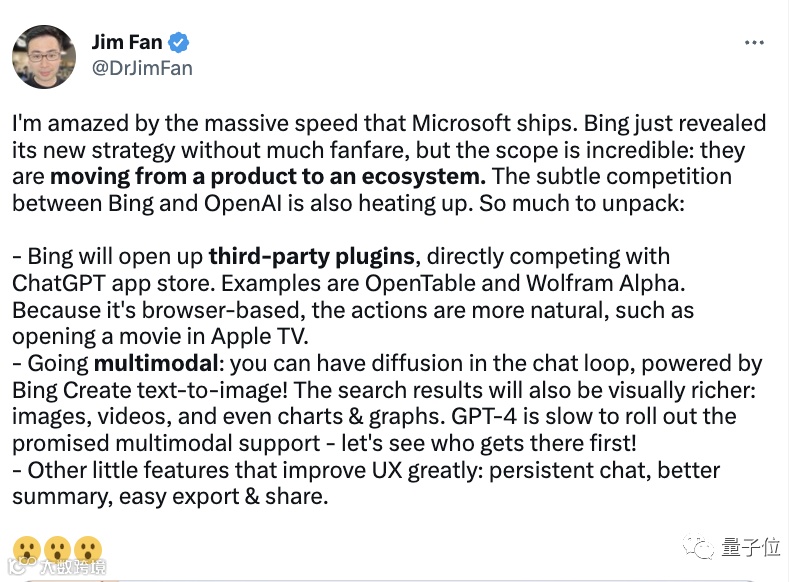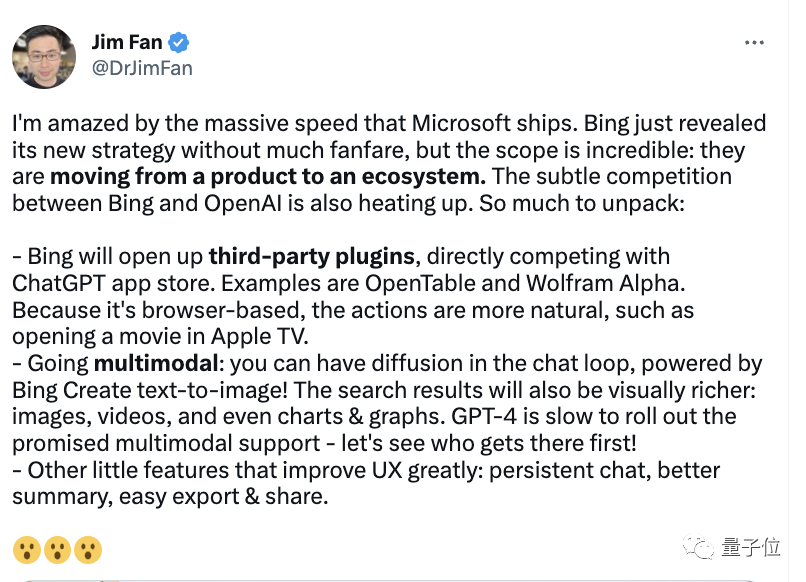 英伟达AI科学家Jim Fan表示:微软正在从一个产品转向一个生态系统。两者之间的微软竞争也正在升温。