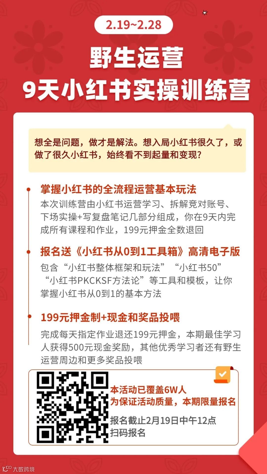 想全是问题,做才是解法。想入局小红书很久了,或做了很久小红书始终看不到起量和变现?欢迎加入今年第 1 期 “野生运营-9天小红书实操训练营”(2.19~2.28),和一票小伙伴跑一遍小红书运营流程,近距离和各类小红书操盘手近距离交流,我相信,这对于你来说,会是一段印象深刻的学习之旅。