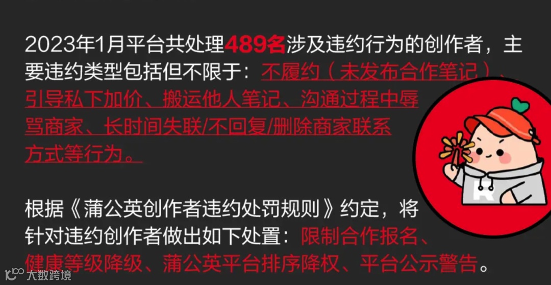 当然,约束是双方的,小红书博主如果接单不履约,也会平台导致处罚,例如2023年1月,小红书就对数百位不履约报备笔记合作的博主进行了处罚。