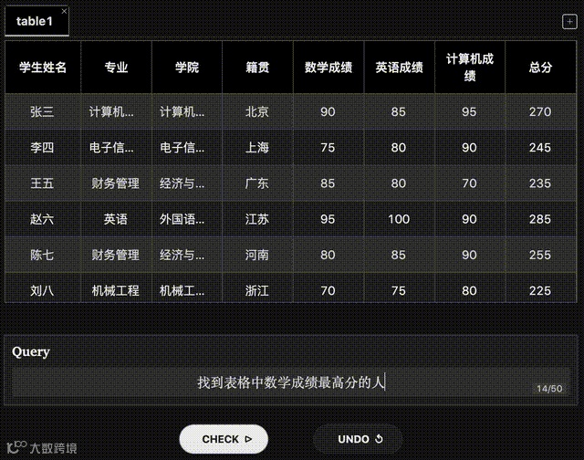 我们找隔壁ChatGPT生成了一份学生成绩单,让ChatExcel进行计算操作。