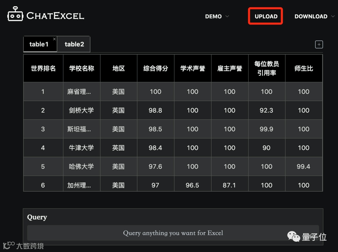 进入主页面后,网站默认展示demo,点击UPLOAD就能上传自己的表格。格式需要是标准Excel文件。
