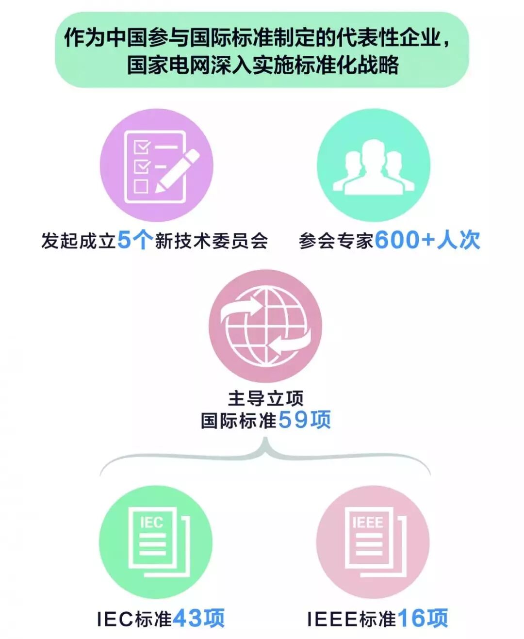在国家标准化管理委员会的支持指导下,我国电力企业发挥主体作用,积极推动科技创新成果转化为技术标准,深入参与国际标准制定,极大地提升了我国在电工领域的国际影响力。截至2018年6月,我国主导制定ISO/IEC标准506项,其中,中国国家电网公司主导制定了59项国际标准,涵盖特高压、智能电网、新能源并网、电动汽车充换电等优势技术领域。