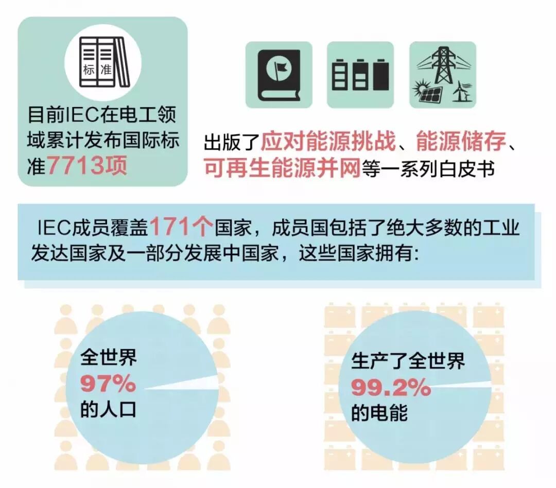 IEC作为世界上成立最早、最具影响力的国际性电工标准化机构,在全球经贸合作发展中发挥着重要作用。国际标准是国际合作、互联互通的通用语言,是全球治理体系和经贸合作发展的重要技术基础。经合组织(OECD)的研究表明,标准和产品合格评定影响着全球80%的投资和贸易。技术标准可以促进经济全球化、投资便利化。IEC成立于1906年,成员覆盖171个国家(我国于1957年正式加入),是电工、电子和相关技术领域全球公认的标准制定和合格评定机构,是目前世界上最具权威性的三大国际标准化组织之一,享有“电工领域联合国”的美誉。电工领域国际标准制定,深刻影响着各国企业开展国际化业务。目前IEC在电工领域累计发布国际标准7713项,出版了应对能源挑战、能源储存、可再生能源并网等一系列白皮书,为促进全球能源电力可持续发展作出了重要贡献。随着经济全球化深入发展,能源电力基础设施互联互通与产能合作加快推进,加强国际标准合作与对接互认的重要性更加凸显。IEC在国际标准制定方面的作用日益突出,对各国电工电子企业参与国际竞争有着深远的影响。