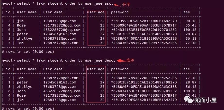 对表中的记录进行升序asc或者降序desc的排列,默认的是升序asc,同时需要使用order by关键字: