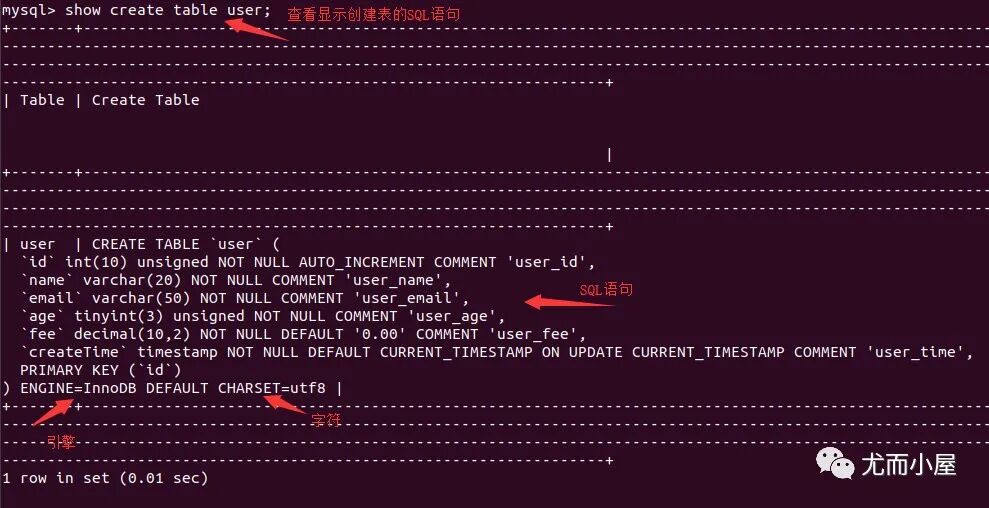 create table user( id int(10) unsigned not null auto_increment comment "user_id", //将id作为主键