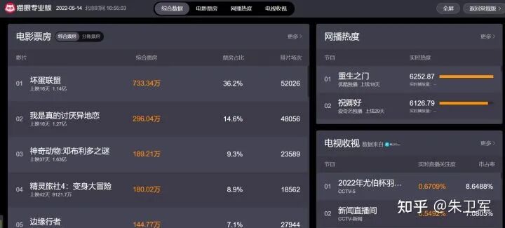 猫眼数据:影视相关数据。汇总了电影票房、网播热度、电视收视等数据,适合做票房预测、节目热度监测。