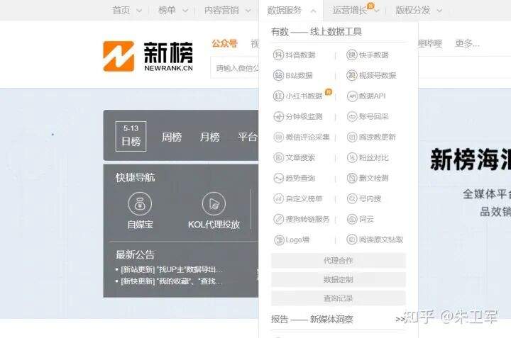 新榜:新媒体专属的数据平台,用于查看抖音、快手、公众号、小红书等平台KOL账号的数据。数据包括了粉丝、浏览、互动、声量等,一般用于广告投放监测、自媒体数据运营等。