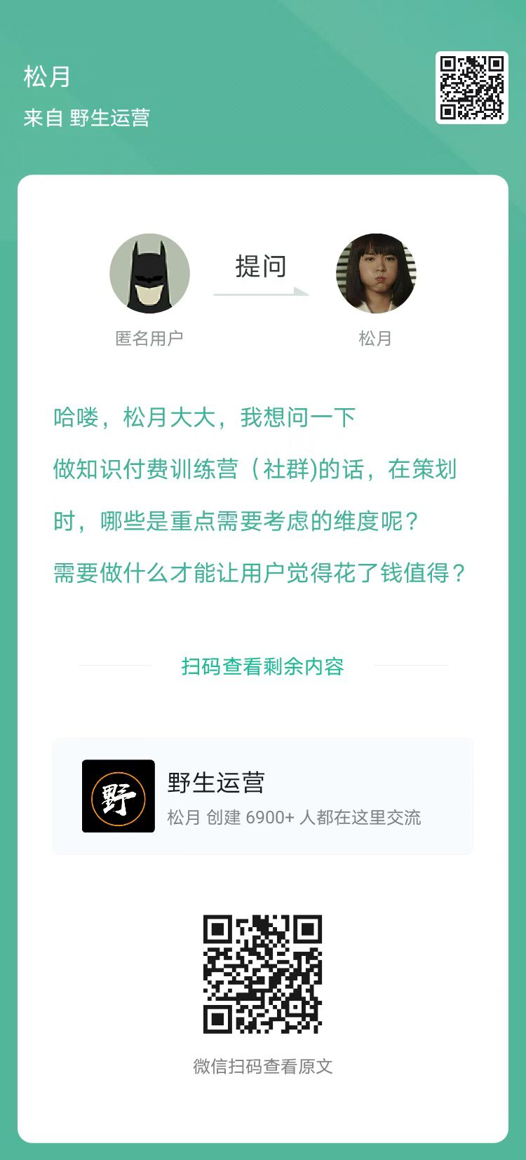 7、提问:做知识付费训练营(社群)的话,在策划时,需要做什么才能让用户觉得花了钱值得?(扫码查看全文)