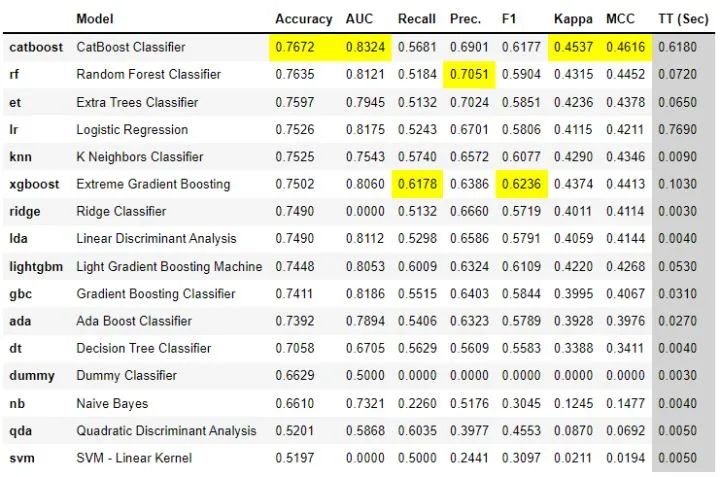 只需几行代码,就可以尝试多个模型,并在整个主要分类指标中对它们进行了比较。