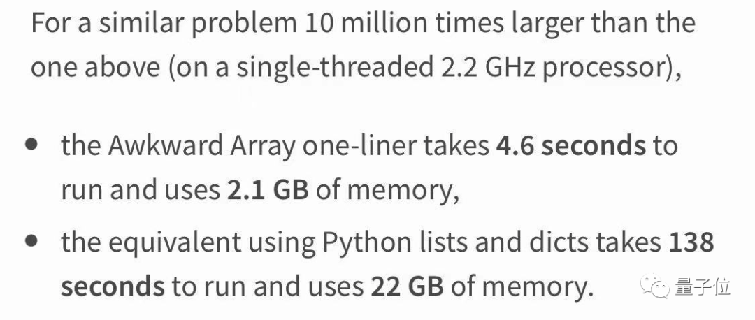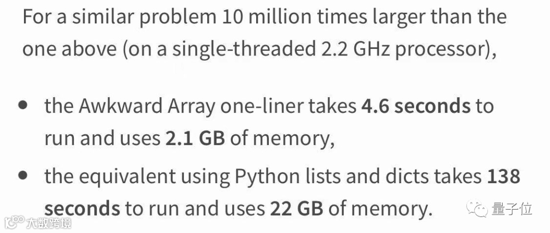 并且,官方表示Awkward Array不仅使用起来更简便,在速度和内存上也有量级的优势。