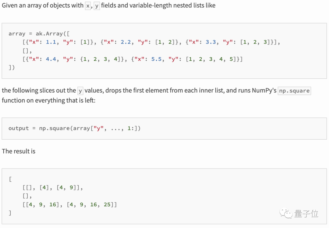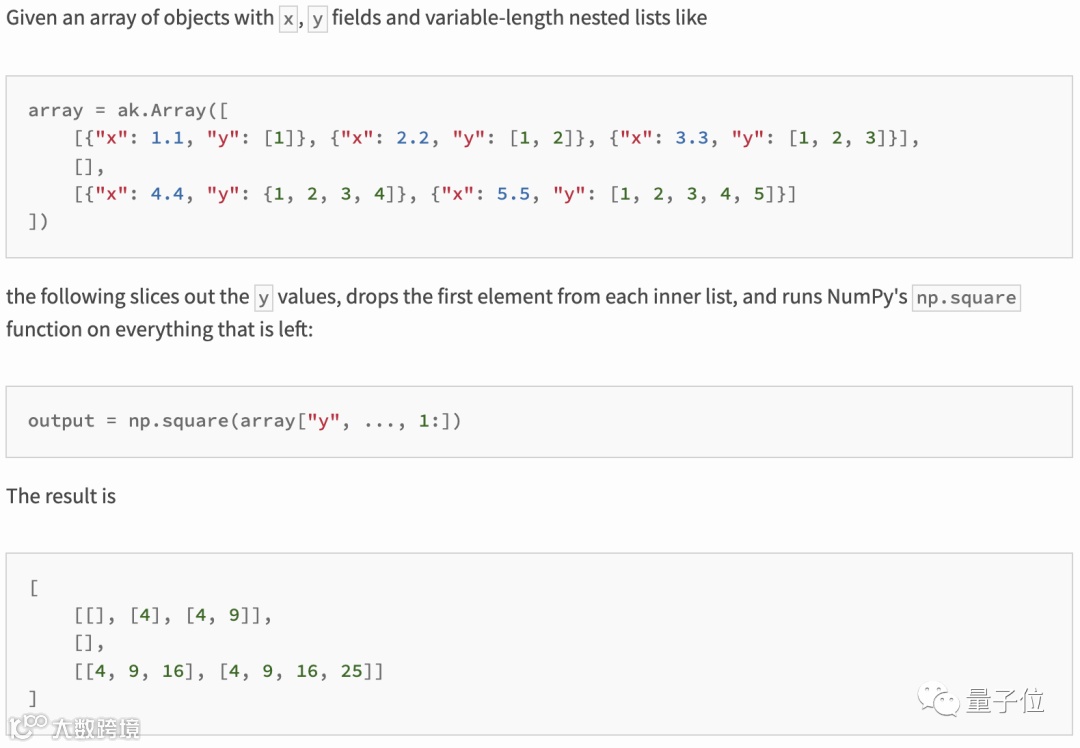 根据官方介绍,Awkward Array用于嵌套的、大小不一的数据,包括任意长度的列表、记录、混合的类型和缺失数据,使用起来类似NumPy。