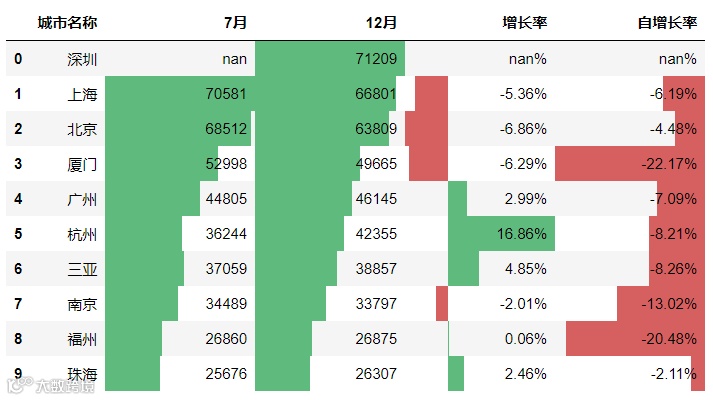 #数据条(df.iloc[0:10,:].style.bar(['7月','12月','增长率','自增长率'],align='mid',color=['#d65f5f','#5fba7d']).format({'7月':'{:.0f}','增长率':'{:.2%}','自增长率':'{:.2%}'}))