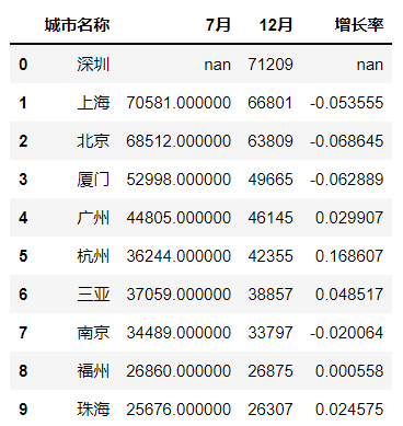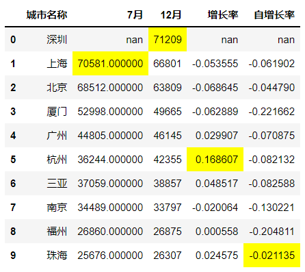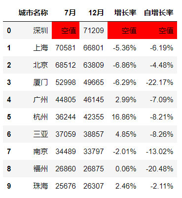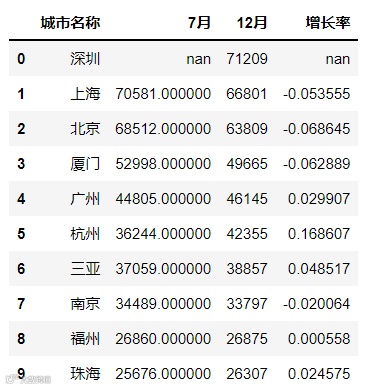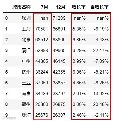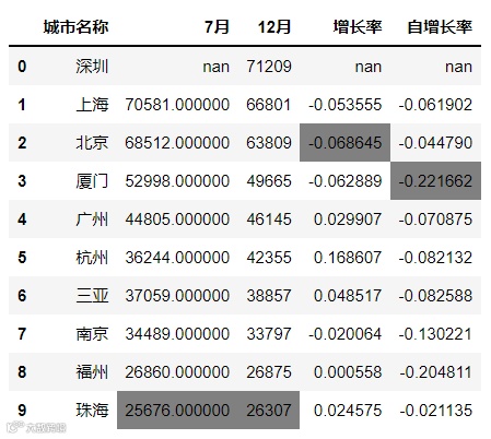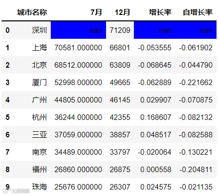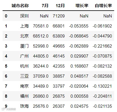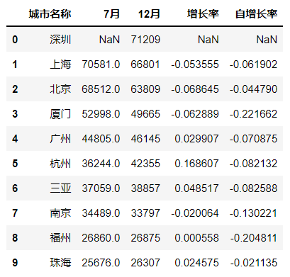 import pandas as pddata_city_price=pd.read_excel(r'C:/Users/尚天强/Desktop/大话数据分析系列原创/pandas/2021年12月全国城市住宅房价排行榜.xlsx')data_city_price['增长率']=(data_city_price['12月']/data_city_price['7月']-1)#.apply(lambda x:format(x,'.2%'))data_city_price['自增长率']=data_city_price['12月'].pct_change(fill_method='ffill')#.apply(lambda x:format(x,'.2%'))df=data_city_pricedf