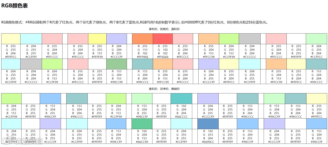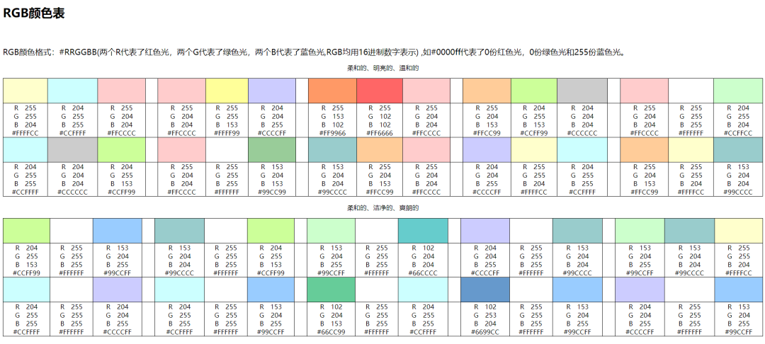 RGB颜色格式:#RRGGBB(两个R代表了红色光,两个G代表了绿色光,两个B代表了蓝色光,RGB均用16进制数字表示) ,如#0000ff代表了0份红色光,0份绿色光和255份蓝色光。