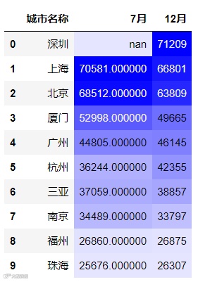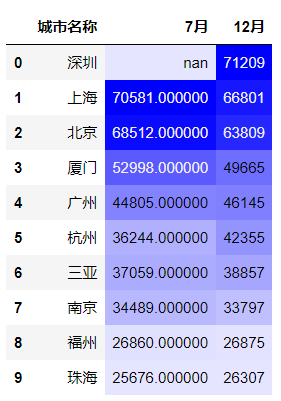 使用pandas设置色阶,类似Excel条件格式中的色阶使用,数值越大,颜色越深,数值越小,颜色越浅。
