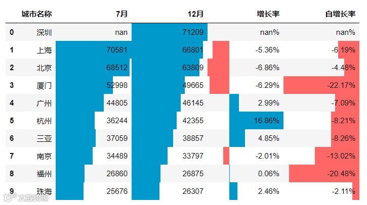 #数据条(df.iloc[0:10,:].style.bar(['7月','12月','增长率','自增长率'],align='mid',color=['#FF6666','#0099CC']).format({'7月':'{:.0f}','增长率':'{:.2%}','自增长率':'{:.2%}'}))