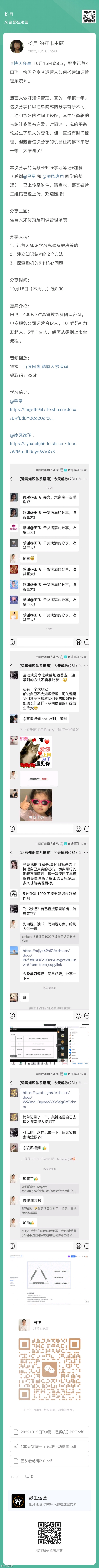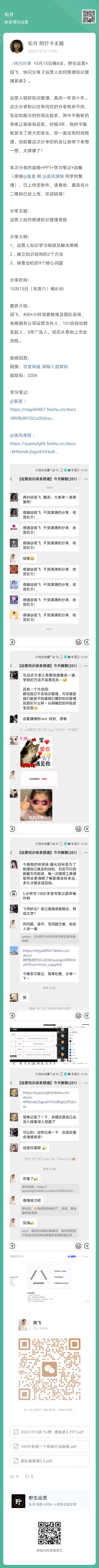 运营人做好知识管理,真的一年顶十年。这次分享和以往单向式的分享有所不同,互动和练习的时间比较多,其中田飞老师的平衡轮带练让我很有启发,时隔3年,我的平衡轮发生了很大的变化,但一直没有时间梳理,但趁着这次分享的机会让我停下来想一想,太感谢了!
