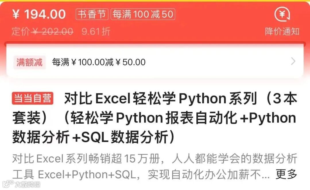 刚好最近京东和当当都在搞活动,要比平常便宜不少,可以趁机囤一波书,不知道买什么书的可以看看我之前列的《一份数据分析师专属的书单》。