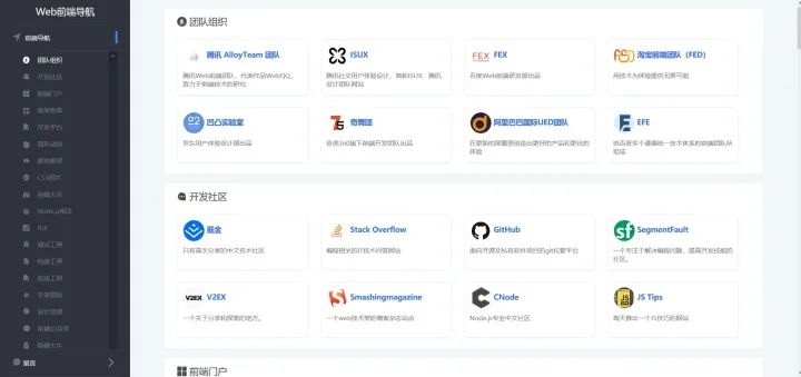 简 介:比较全的Web前端导航,包括 团队组织 、开发社区 、 前端门户、框架类库 等等网站的导航。 -