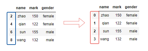 数据清洗时,会将带空值的行删除,此时DataFrame或Series类型的数据不再是连续的索引,可以使用reset_index()重置索引。