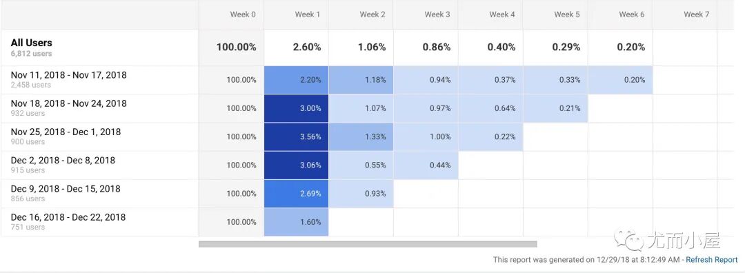 从上面的数据中我们可以看到:前6天的留存情况还是很漂亮(颜色较浅,留存率相对较高)。