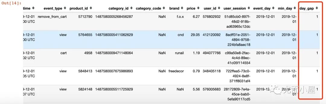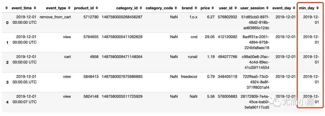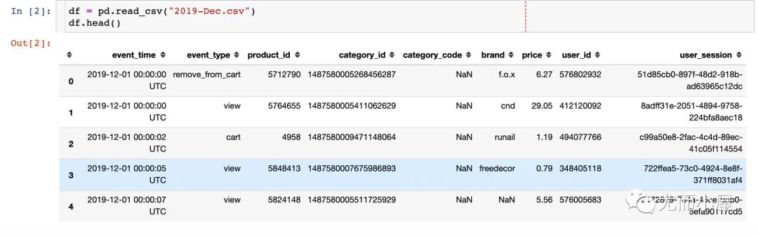 本文中使用的一份数据集是从kaggle下载,主要是包含事件发生时间、类型(阅览、加购、移除购物车和购买)、产品ID、分类ID、产品编码、品牌、价格、用户ID、用户会话,总共7个属性
