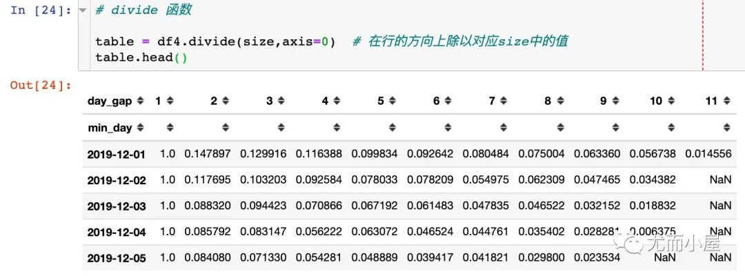 table = df4.divide(size,axis=0) # 在行的方向上除以对应size中的值