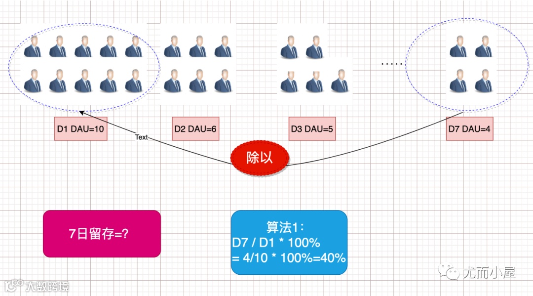 第一种算法是:第7天活跃人数 / 第1天活跃人数 * 100%