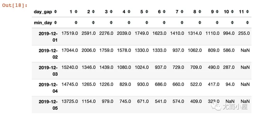 df4 = df3.pivot(index="min_day",columns="day_gap",values="user_id")