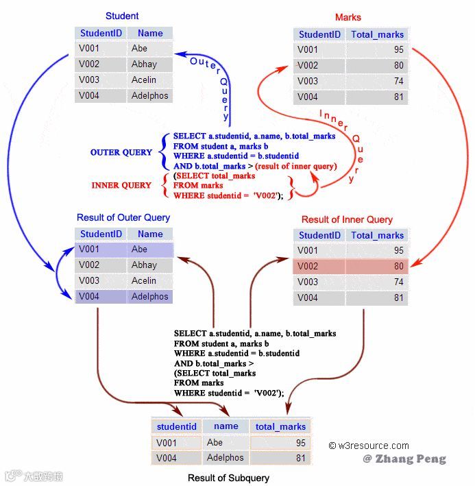()括起来。内部查询首先在其父查询之前执行,以便可以将内部查询的结果传递给外部查询。执行过程可以参考下图: