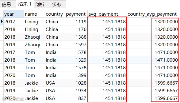 SELECT *, AVG(payment) OVER() as avg_payment,AVG(payment) OVER(PARTITION by country) as country_ayg_paymentfrom pay;