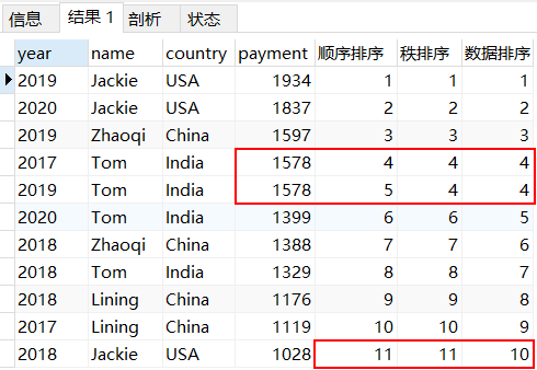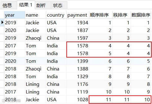 SELECT *,ROW_NUMBER()OVER(ORDER BY payment DESC) as '顺序排序',RANK()OVER(ORDER BY payment DESC) as '秩排序',DENSE_RANK()over(ORDER BY payment DESC) as '数据排序'from pay;