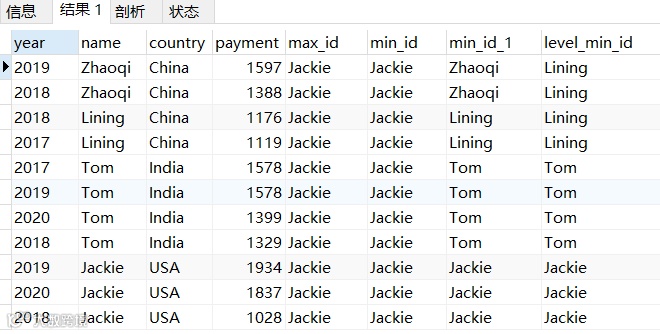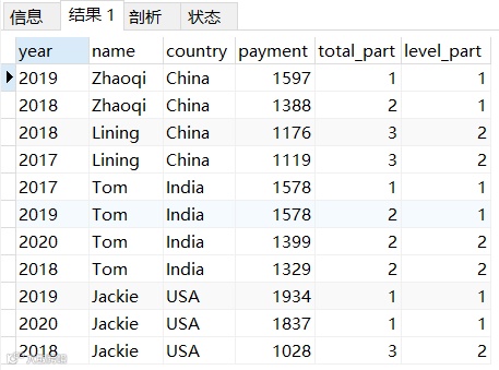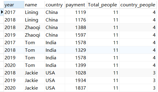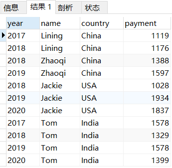 # 给金额表插入数据INSERT INTO pay(year,name,country,payment) VALUES(2017,'Lining','China',1119),(2018,'Lining','China',1176),(2018,'Zhaoqi','China',1388),(2019,'Zhaoqi','China',1597),(2018,'Jackie','USA',1028),(2019,'Jackie','USA',1934),(2020,'Jackie','USA',1837),(2017,'Tom','India',1578),(2018,'Tom','India',1329),(2019,'Tom','India',1578),(2020,'Tom','India',1399);