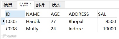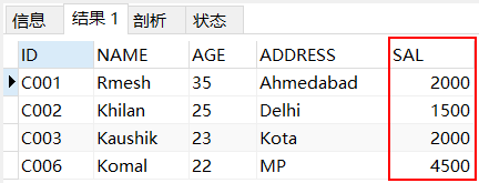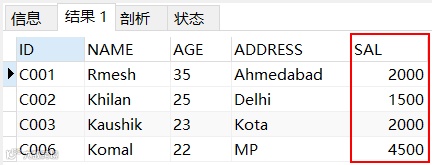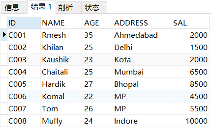 # 给薪水表插入数据INSERT INTO SALARY(ID,NAME,AGE,ADDRESS,SAL) VALUES('C001','Rmesh',35,'Ahmedabad',2000),('C002','Khilan',25,'Delhi',1500),('C003','Kaushik',23,'Kota',2000),('C004','Chaitali',25,'Mumbai',6500),('C005','Hardik',27,'Bhopal',8500),('C006','Komal',22,'MP',4500),('C007','Tom',26,'MP',5500),('C008','Muffy',24,'Indore',10000);