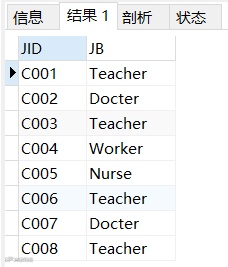# 给职位表插入数据INSERT INTO JOB(JID,JB) VALUES('C001','Teacher'),('C002','Docter'),('C003','Teacher'),('C004','Worker'),('C005','Nurse'),('C006','Teacher'),('C007','Docter'),('C008','Teacher');