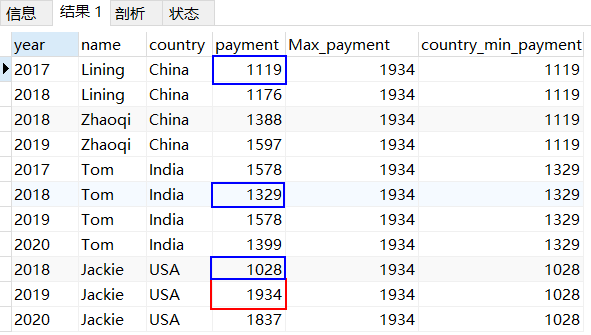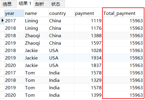 这里MAX(payment)函数对整个数据计算最大值,使用PARTITION by对于不同的国家分组后然后计算最小值。