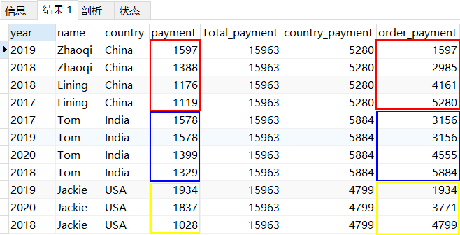 SELECT *, SUM(payment) OVER() as Total_payment,SUM(payment) OVER(PARTITION by country) as country_payment,SUM(payment) OVER(PARTITION by country ORDER BY payment DESC) as order_paymentfrom pay;