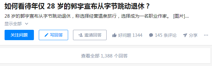 前段时间,知乎一篇《如何看待年仅28岁的郭宇从字节跳动退休》的帖子,近1000万的浏览量走红!