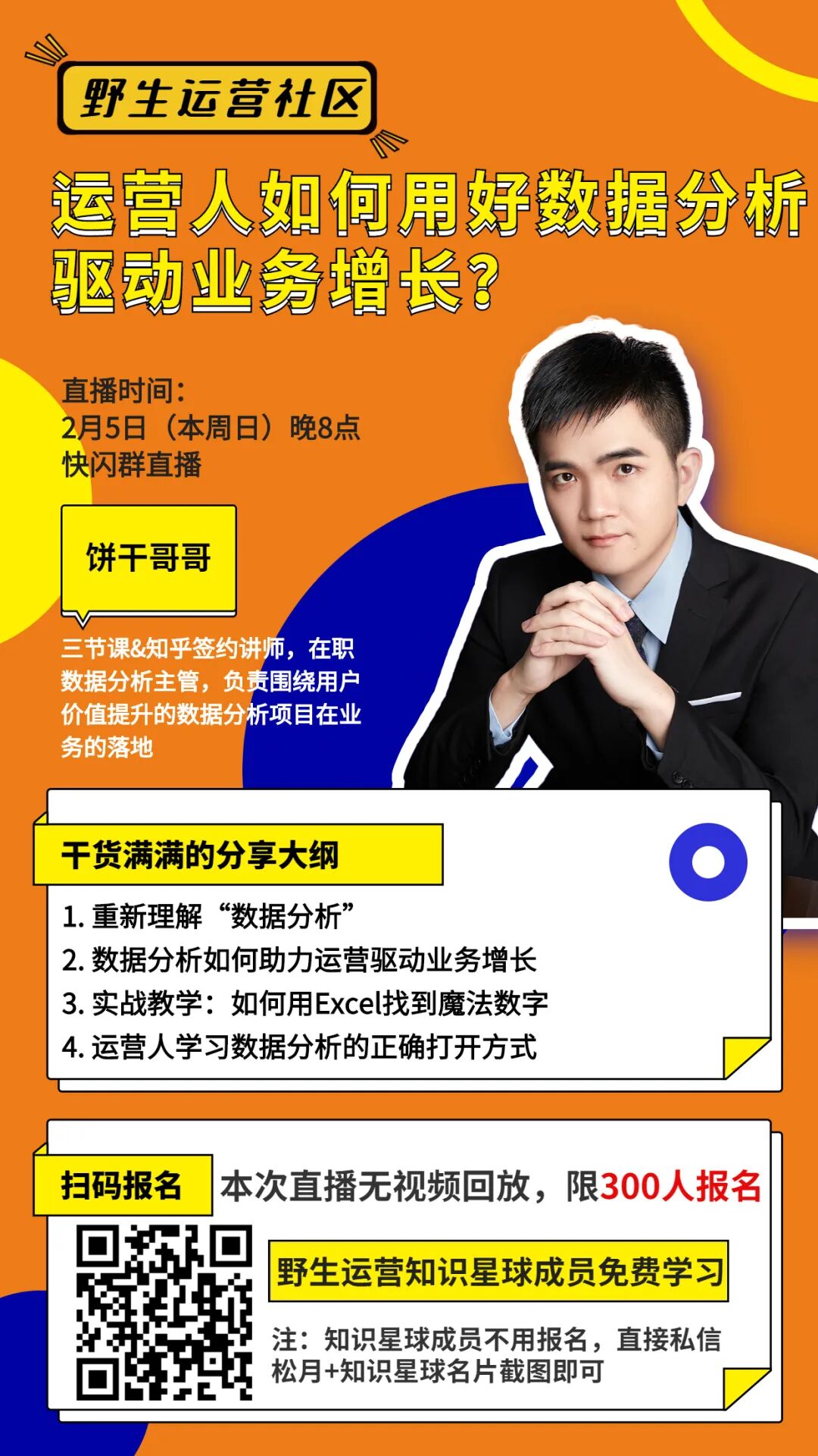 本课程适合想深入学习数据分析,并以此来驱动个人业务增长的运营人,另外本次分享不设视频回放,限量场观 300 人,想报名的小伙伴先上车😎