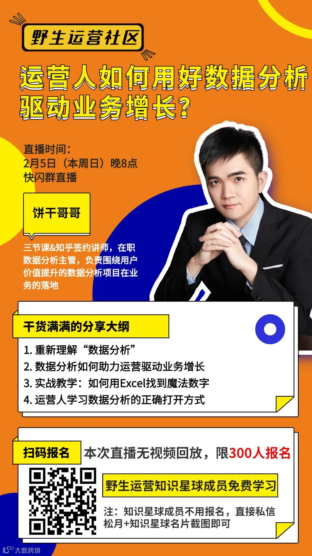 本周日晚 8 点,我邀请到饼干哥哥,三节课&知乎签约讲师,在职数据分析主管,带来分享《运营人如何用好数据分析驱动业务增长》。
